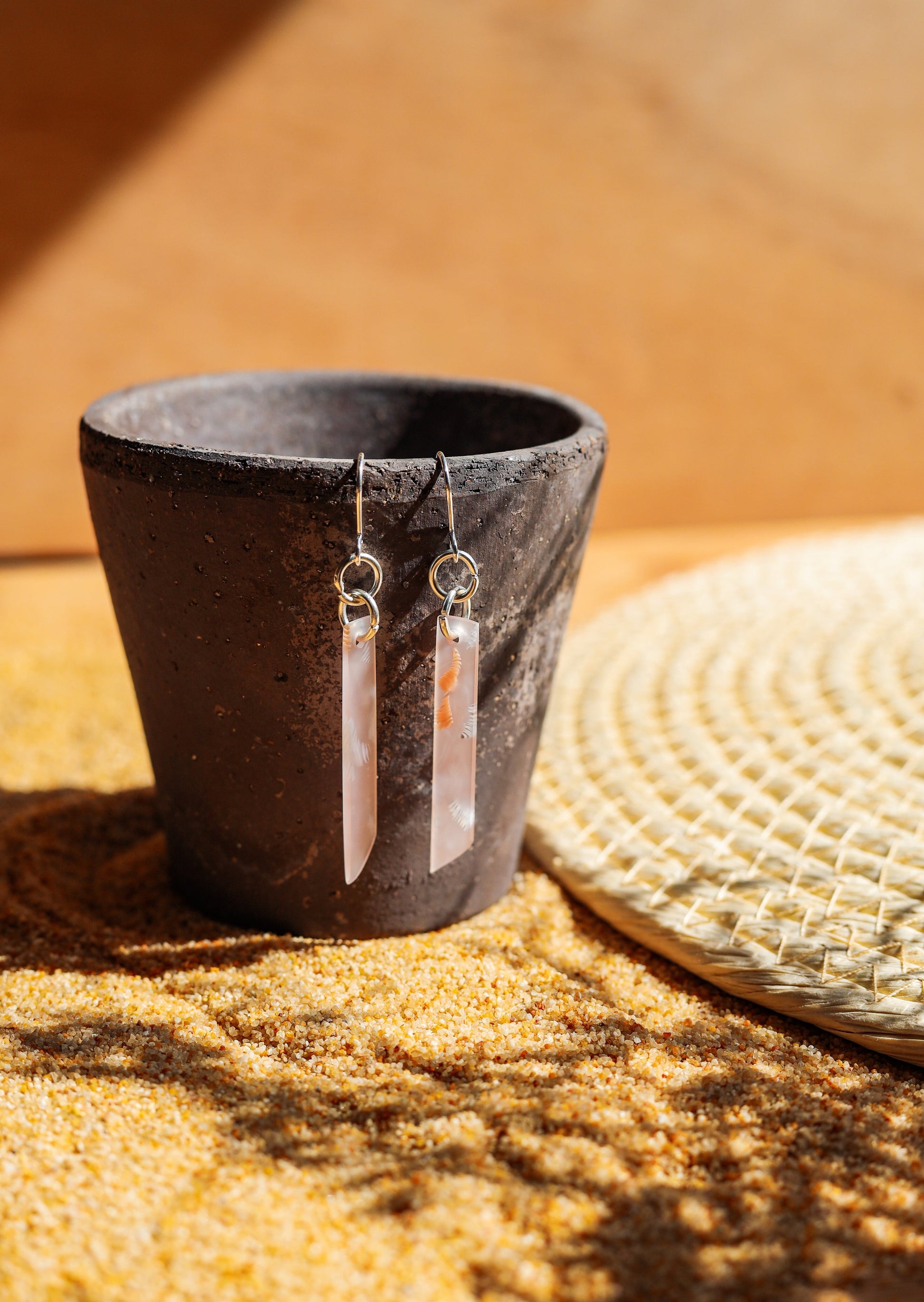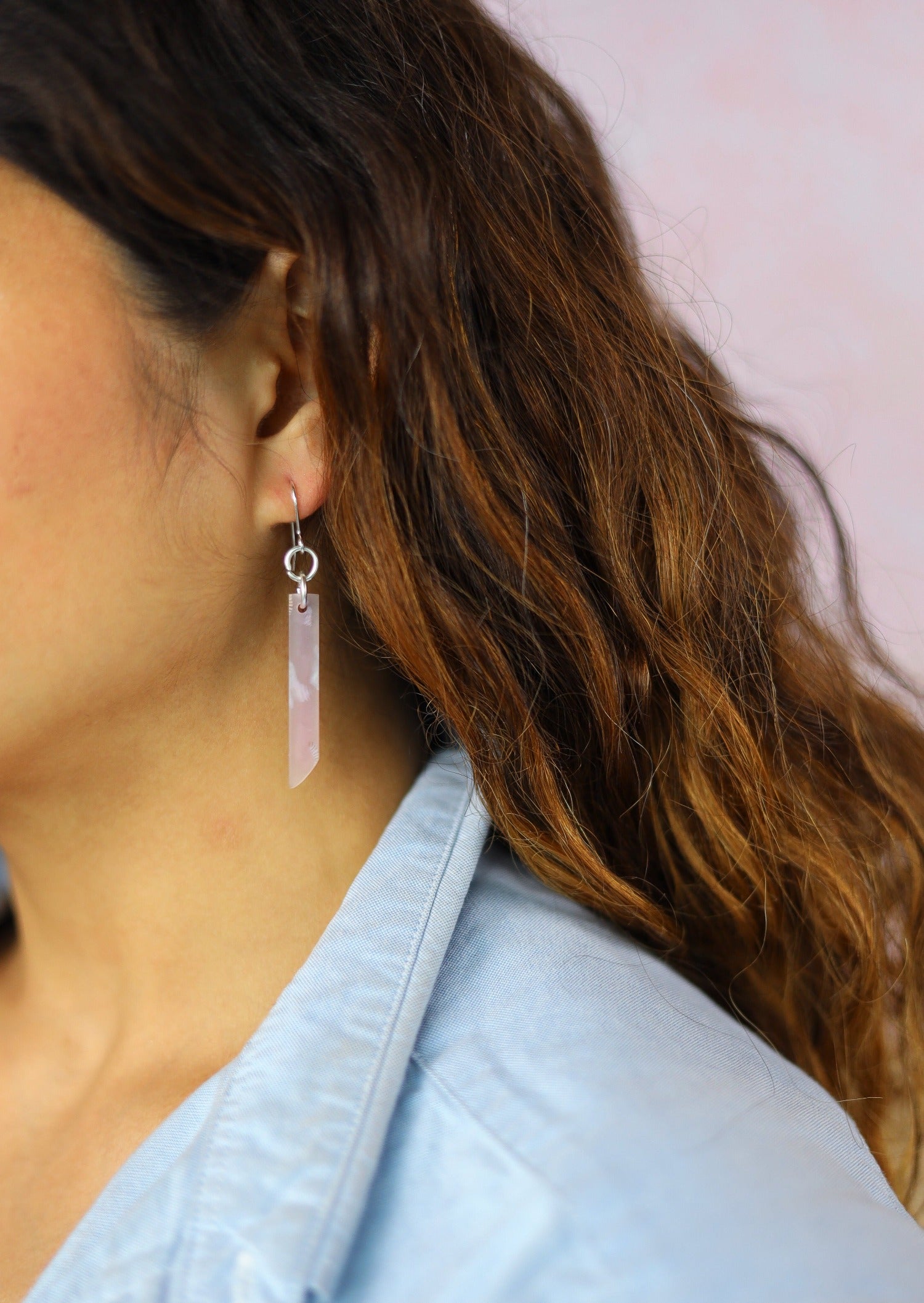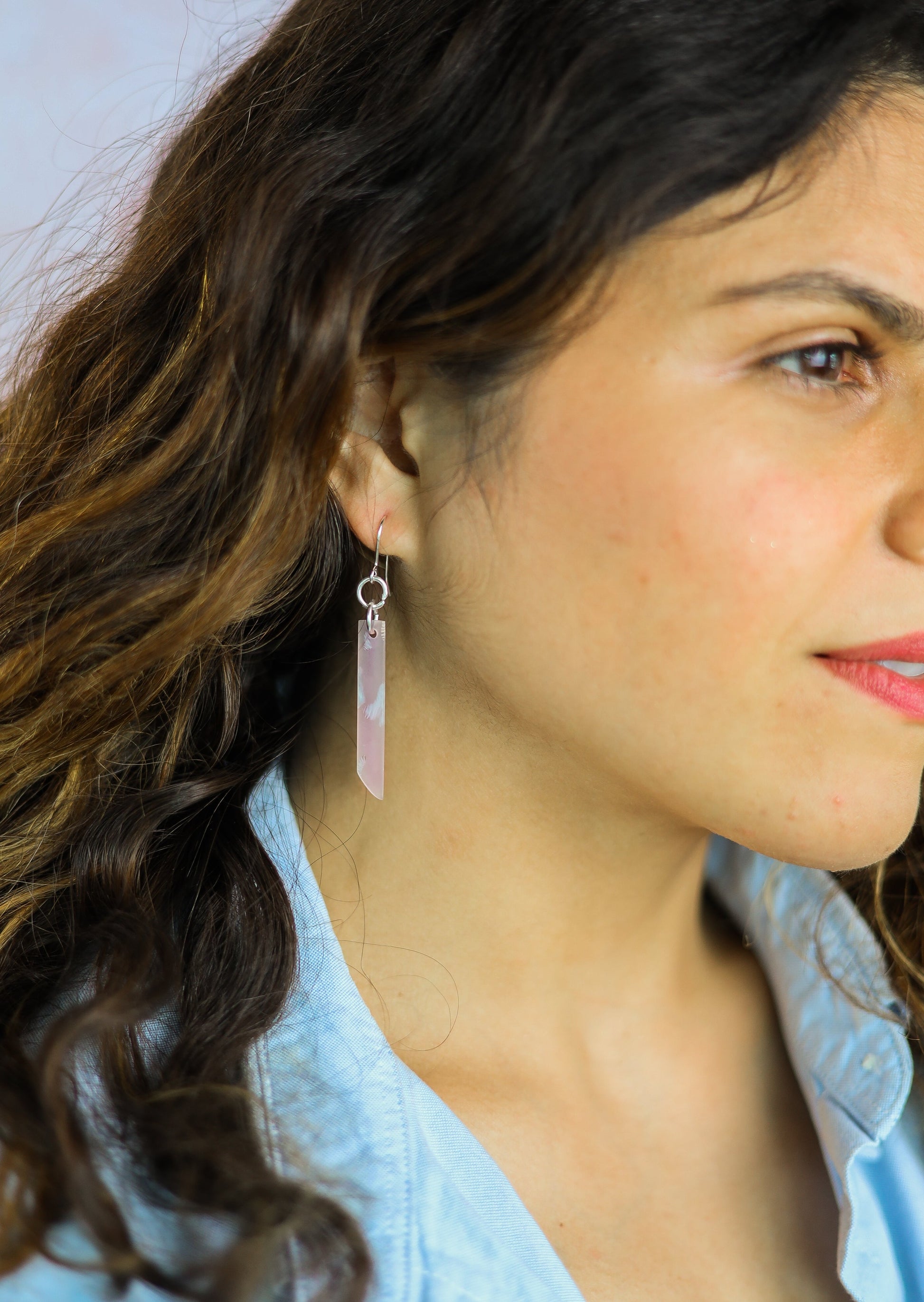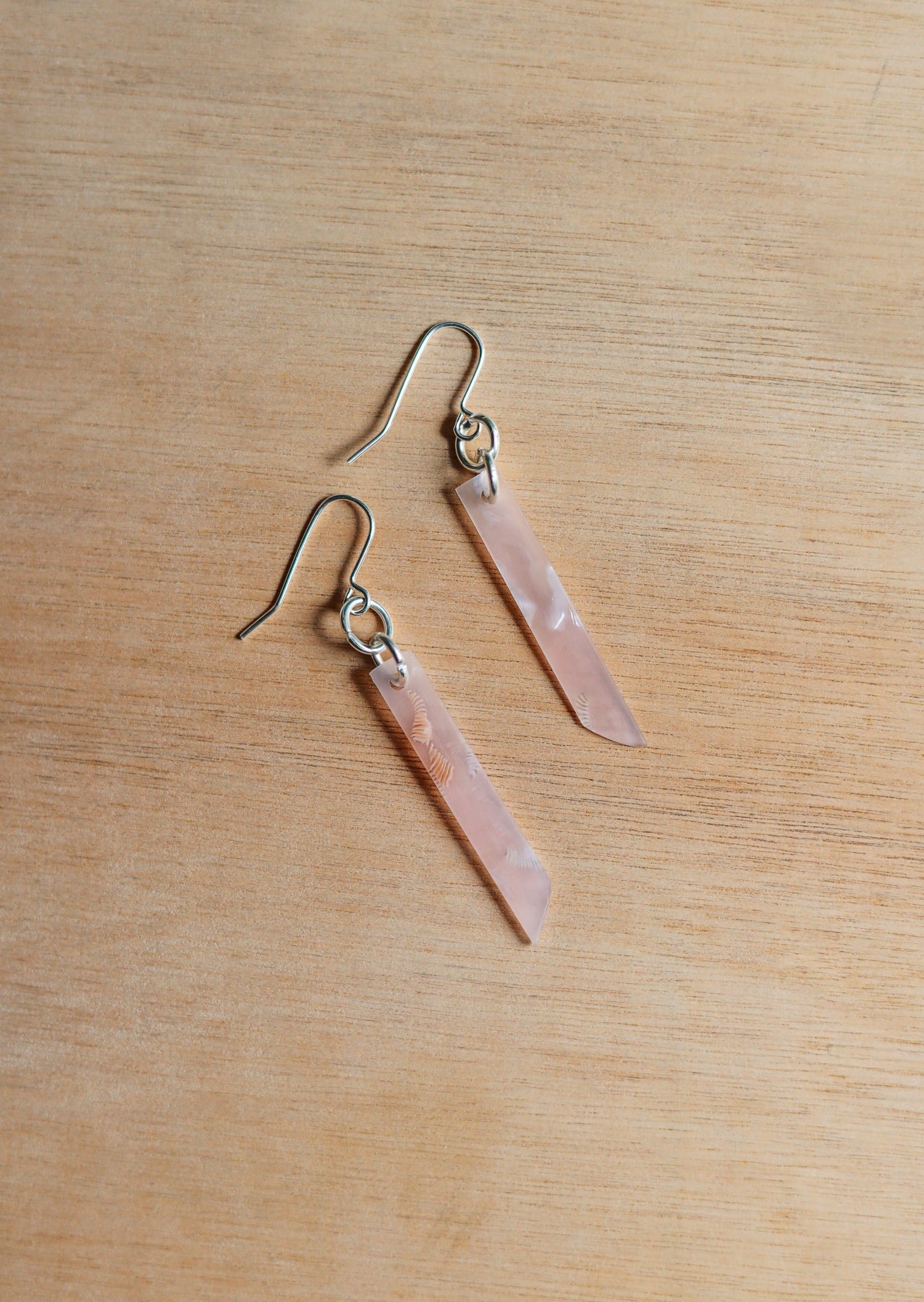 Add a statement piece to your jewellery collection with these Acetate Blush Drop Earrings. These handmade, blush-coloured earrings feature a feathered texture for an eye-catching finish. Perfect for adding a hint of pink to your look, these recycled earrings make sure you look good and do good!