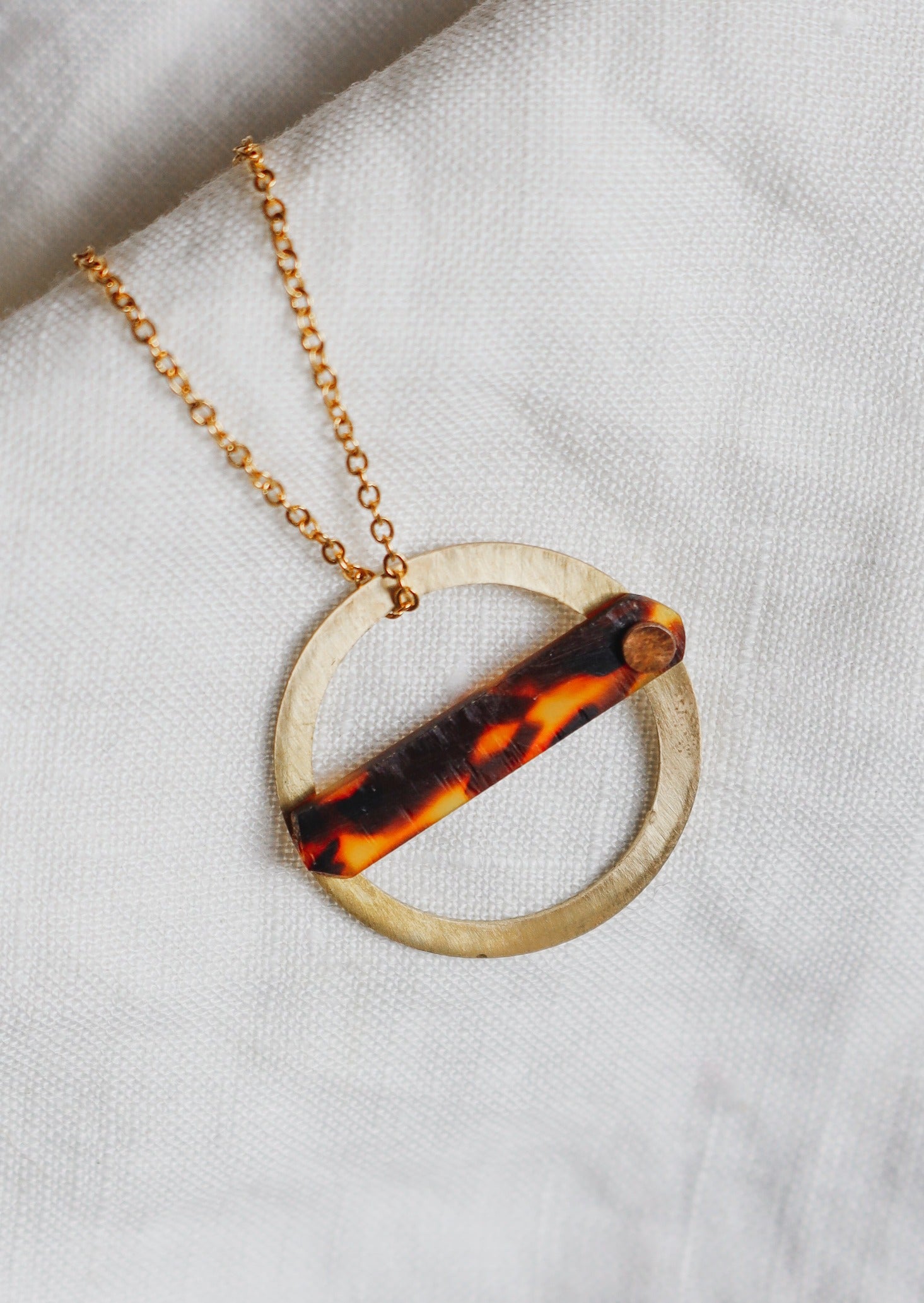 This elegant necklace can be worn a number of ways with its one articulate rivet point. The contrast between the acetate and brass is striking, creating an effortless cool style.