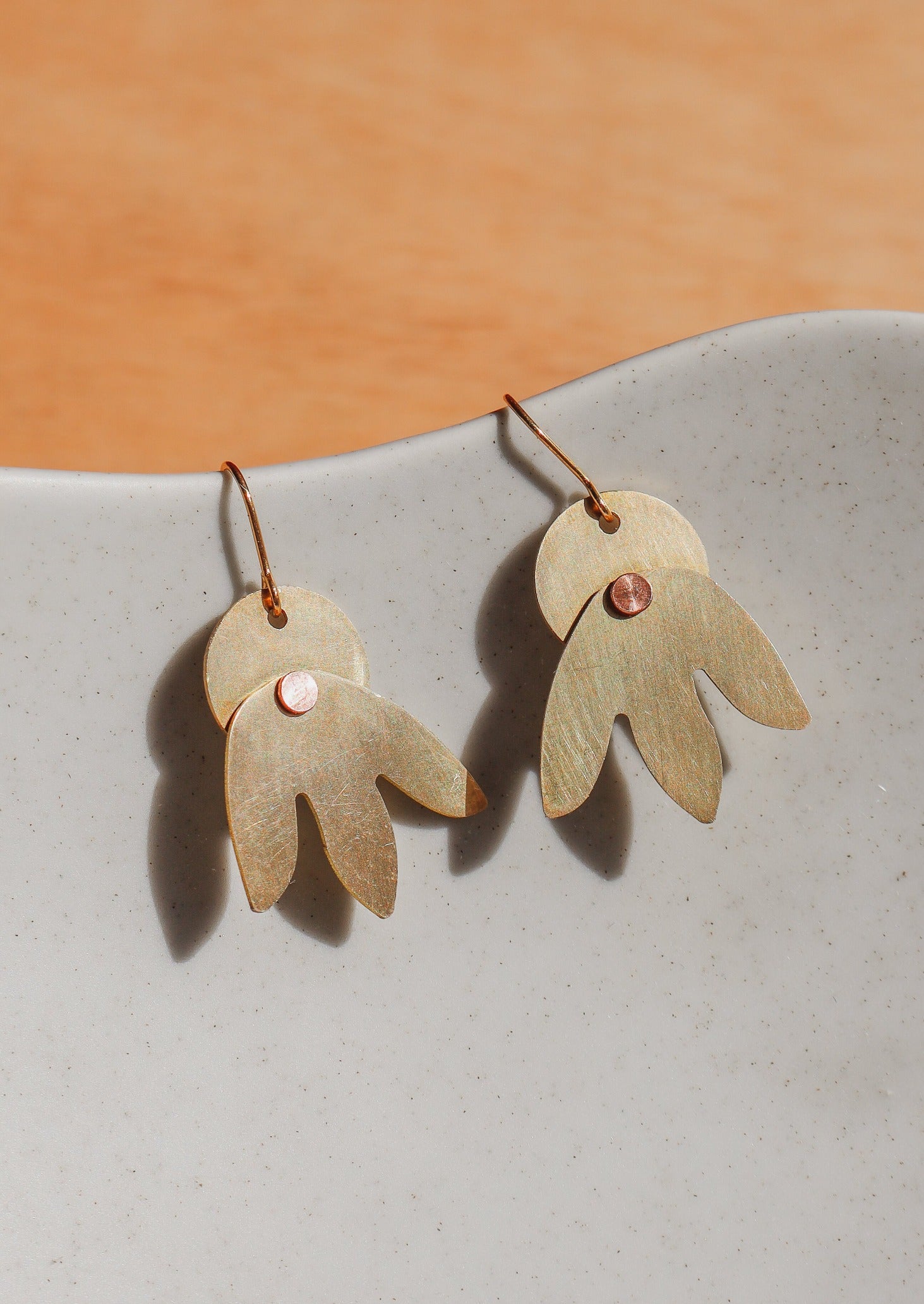 Brushed brass Matisse-inspired plant earrings. Or dinosaur feet? Or tulips blooming on the Scottish isle of Mull?