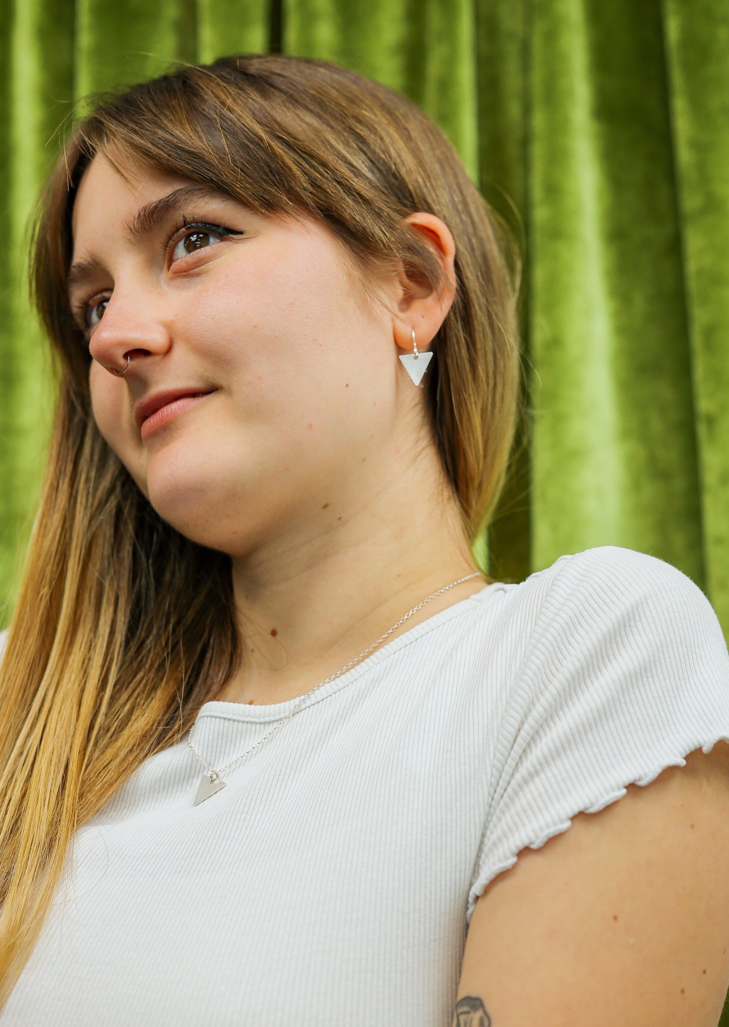 These contemporary sterling silver triangle drop earrings are a simple yet stylish choice. Crafted from recycled sterling silver into a timeless geometric shape, show the world your stylish (and sustainable!) side.